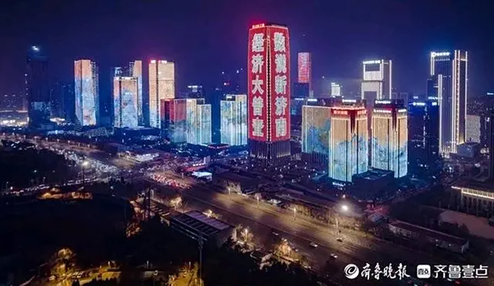 2023年12月31日,濟南市地標性建筑綠地中心燈光璀璨,303米高的樓體上,“支持經(jīng)濟普查 助力泉城發(fā)展”五經(jīng)普標語點亮跨年夜空,為市民帶來一場美輪美奐的光影盛宴。