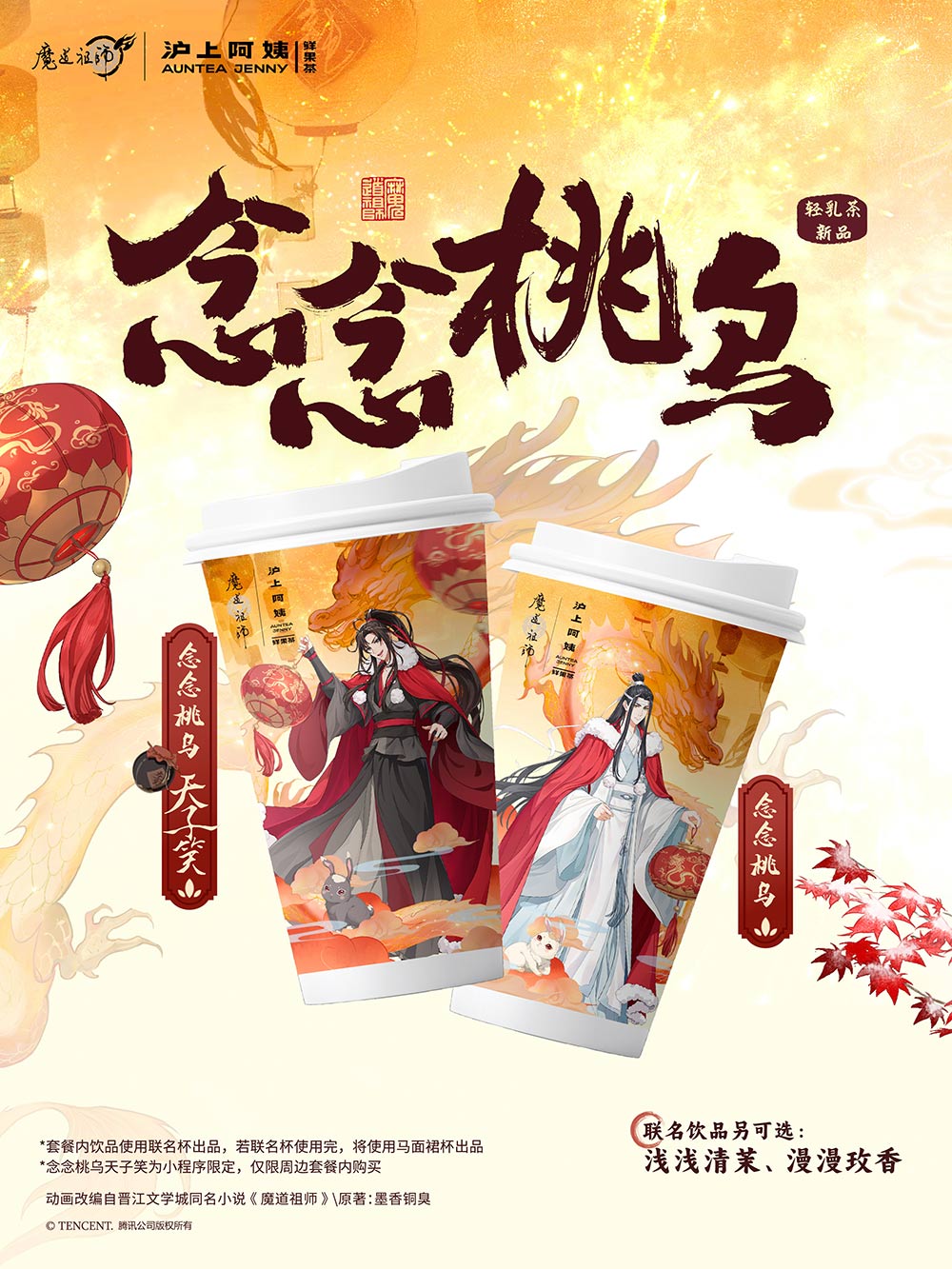 滬上阿姨與《魔道祖師》的聯(lián)名以輕乳茶為主要產(chǎn)品,取名為“念念桃烏”,“念念桃烏” 是一款不含酒精卻有白酒風(fēng)味的飲品,對(duì)應(yīng)聯(lián)名IP劇情中的“天子笑”元素。品牌準(zhǔn)備了設(shè)計(jì)精美的龍年主題聯(lián)名杯子,將魏無羨和藍(lán)忘機(jī)的形象印在了同一款聯(lián)名產(chǎn)品的AB面上,使其更貼合聯(lián)名主題。