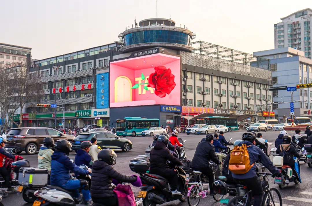 女神節(jié),華途傳媒聯(lián)合TATA木門品牌利用經(jīng)十路裸眼3D巨幕LED大屏,定制一顆巨型愛(ài)心和一朵巨型玫瑰花在女神節(jié)早高峰7:00-7:30,霸屏文案“你守護(hù)TA的少女心,我“門”圓TA的公主夢(mèng)”半小時(shí),向泉城女性致敬向泉城女神表達(dá)節(jié)日祝福。