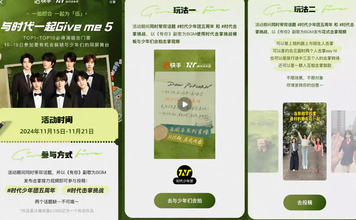 快手也不遺余力地推出票房與線上下單元的結合,力求為觀眾們提供更優(yōu)質的視聽體驗。在這場五周年的慶典中,粉絲們的參與感尤為重要,大家可以通過“時代擊掌挑戰(zhàn)”參與互動,提交自己的擊掌視頻,與時代少年團共同點亮這場盛會的舞臺。