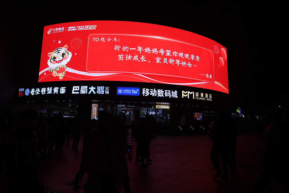 中國郵政作為書信的傳遞者,書信文化的傳承者,致力于弘揚(yáng)中國傳統(tǒng)書信文化,打造“書信中國”品牌,講好中國故事?!拔沂謱懳倚?,見字如面?!?021年12月25日至31日,山東郵政推出“2022張賀卡免費(fèi)寄”活動(dòng)。只要市民掃描“泉眼”齊魯國際大廈戶外LED屏、“省俯”彩云大廈戶外LED屏、“網(wǎng)紅屏”世茂廣場戶外LED屏上的“山東郵政官微二維碼”,上傳新春祝福語,山東郵政將隨機(jī)抽取2022個(gè)名額,免費(fèi)郵寄新年祝福賀卡。