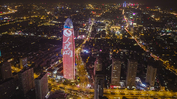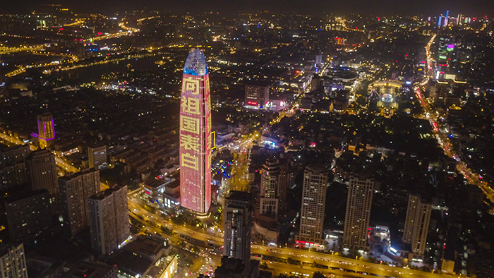 9月20日晚,人民網(wǎng)“向祖國(guó)表白”公益燈光秀在華途傳媒濟(jì)南市綠地中心地標(biāo)點(diǎn)亮。